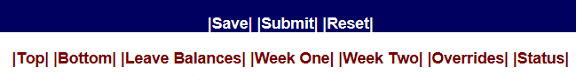 Submit – Will submit the time sheet as it is, and send to the Approver, Reviewer or the Central Payroll Officer (CPO).  If your agency uses the Leave/Overtime Request, you cannot submit your time sheet until the Leave/Overtime Request has been approved.  An error message will be displayed until the request has been approved.  After a time sheet has been submitted you will be able to make changes until the review is completed or the time sheet has been approved.