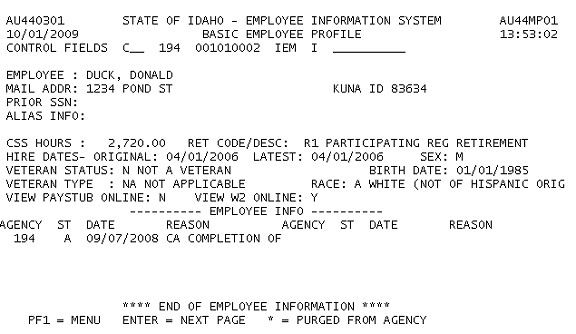 : The IEM screen displays the employee's base information that is established by the Personnel Change action and is updated with the Employee Base Information action in IPOPS. The information contained on this screen includes name, address, birthdate, employee's credited state service balance, etc.