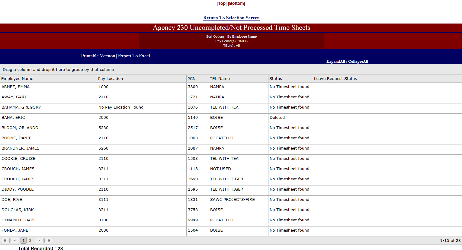 Purpose:  This report will access the current/working database and report employees with time sheets that are Awaiting Approval, Blank, Disapproved, Deleted, and Draft.